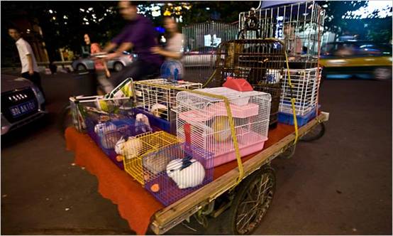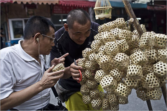 한편 손님을 끌기 위해 큰 목소리로 외칠 필요가 없는 상인이 있는데 바로 메뚜기를 파는 상인이다. 메뚜기집 안의 메뚜기 울음 소리가 그의 목소리를 대신해주기 때문이다. 메뚜기는 한 마리에 0.5~ 1위안이면 살 수 있다.