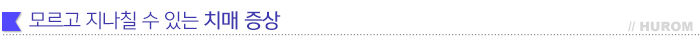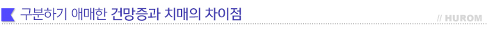 치매 초기에는 일반적인 노화증상으로 오해해 치매가 진행되고 있음에도 치료하지 않는 경우가 많습니다. 치매 환자의 경우에는 시간이 지날수록 기억력장애가 심해지기 때문에 적절한 치료를 받지 않는다면 심각한 결과를 초래할 수 있는데요. 건망증과 달리 다양한 증상을 동반하는 치매의 대표적인 증상인 기억력장애 외에 언어장애, 수행능력 장애 등의 인지능력 장애를 부를 수 있습니다.