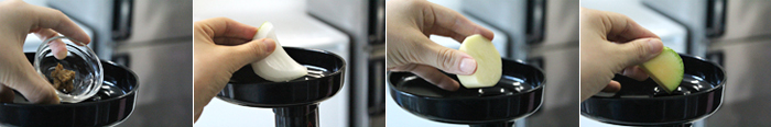 요리에 앞서 휴롬을 세팅합니다. 착즙 망은 과일 망을 사용해주세요. 세팅한 휴롬에 애호박, 감자, 양파와 된장을 넣어주세요.