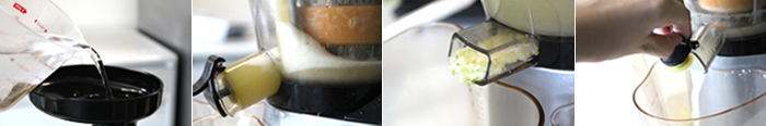 2. 과일 망을 장착한 휴롬에 감자, 애호박, 양파를 투입한다. 부드럽게 섞이도록 다시마 우린 물을 일정량 넣어준다.