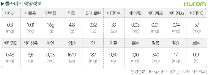 콜라비는 순무나 양배추 등에 비해 단백질, 회분, 칼슘, 비타민C 등의 함량이 4~10배 정도 높습니다. 특히 칼슘의 함량이 높기 때문에 성장기 어린이가 섭취하면 골격과 치아를 튼튼하게 만드는데 도움이 됩니다. 또 뼈가 약한 성인들의 골다공증 개선에도 효과가 좋습니다.