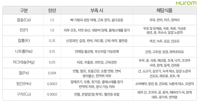 칼슘은 가장 대표적인 미네랄로, 대부분은 뼈와 치아를 만드는 데 사용되지만 1% 가량은 혈액을 타고 돌면서 근육이나 신경의 기능을 조절하고 혈액 응고를 돕습니다. 또한 체중 조절, 당뇨, 대장암 예방 등의 역할을 하며, 부족 시에는 성장 지연 및 골연화증, 골다공증의 발생 위험이 높습니다.
