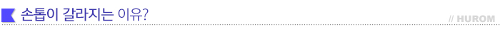 손톱은 건강의 척도 중 하나로써 우리의 몸 상태와 밀접한 관련이 있습니다. 건강한 손톱은 아치형의 분홍빛을 띄고, 반달 모양의 흰색이 손톱 안쪽에 적당히 자리 잡고 있어야 합니다. 하지만 손톱이 갈라지거나 조금만 부딪혀도 깨지는 현상이 종종 일어나기도 하는데요. 특히 우리나라 여성들의 80~90% 이상은 손톱이 약해, 언제든 손톱 건강의 위험에 노출되어 있습니다. 이번 시간에는 내 몸의 건강신호인 손톱이 갈라지는 이유는 무엇이고 어떻게 예방할 수 있는지 함께 알아보도록 하겠습니다.
