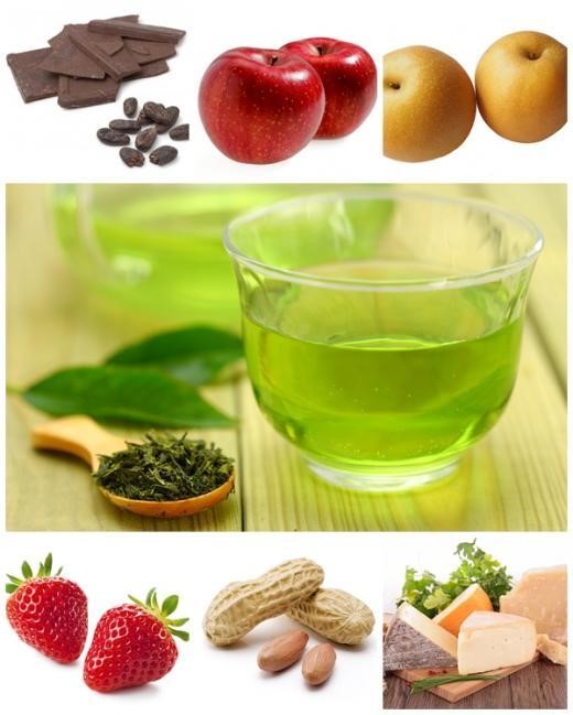 | (시계방향으로) 다크 초콜릿, 사과, 배, 녹차, 치즈, 견과류, 딸기 |
