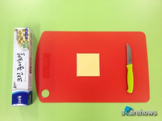 시작하기에 앞서 준비할 것들 : 체다슬라이스치즈 먹고싶은 만큼, 도마, 칼, 접시, 종이호일, 전자레인지, 준비시간(3분30초), 전자레인지(1분 30초)