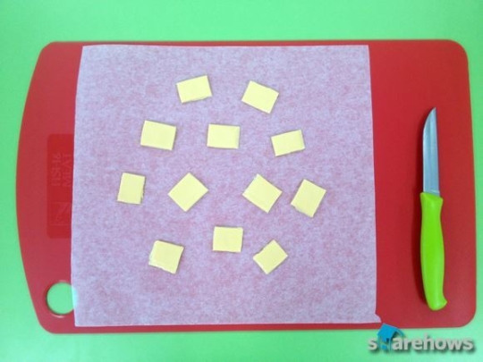스텝 2. 치즈를 먹기 좋은 크기로 잘라 종이 호일 위에 올린다.