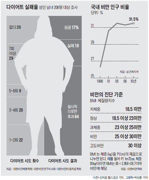 박씨처럼 살을 빼기 위해 온갖 노력을 하지만 실패하는 사람이 많다. 조선일보에 따르면 2014년 대한비만체형학회 등이 성인 남녀 208명을 대상으로 설문조사를 한 결과, 80%(173명)가 '최소 한 번 이상 다이어트를 시도해 본 적이 있다'고 답했다. 이 중 다이어트에 성공했다고 답한 사람은 17%(28명)에 불과했다. 한 리서치 회사에서  성인 남녀 1023명을 대상으로 실시한 설문 조사에서는 남성의 약 54%(234명), 여성의 약 81%(476명)가 다이어트에 실패한 적이 있다고 대답했다. 다이어트를 시도하는 사람은 많지만, 10명 중 2명도 채 성공을 거두지 못하고 있는 것이다. 다이어트를 해도 살이 전혀 빠지지 않거나, 기껏 뺀 살이 얼마 지나지 않아 도로 찌는 경우가 대다수다〈그래픽〉.