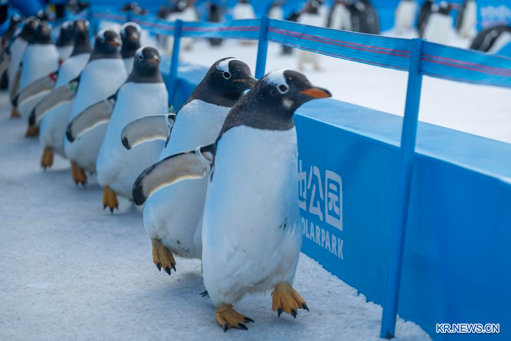 "게구쟁이 펭귄 퍼레이드" 행사가 13일 흑룡강성 할빈 극지공원에서 진행됐다. 100마리의 남극 펭귄이 단체로 퍼레이드를 벌여 많은 시민과 려행객들의 눈길을 사로잡았다.