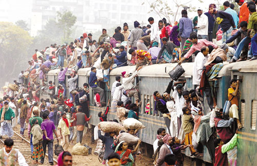 이슬람 최대 축제인 '이드 알 아드하' 축제에 참석하기 위해 고향으로 가는 방글라데시인들이 19일 다카역에서 렬차에 타려고 애쓰고 있다. 축제에서는 소나 양, 락타 등이 신에게 제물로 바쳐지는데 자신의 아들을 기꺼이 신에게 바치려 했던 아브라함을 기념하기 위한것이다. /외신