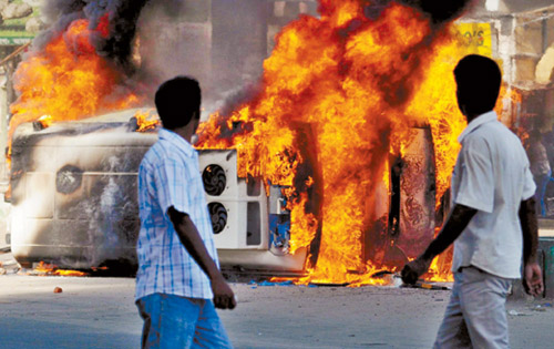 30일 인도 동북부 아삼 주의 주도 가우하티 중심지 가네시구리에서 폭발로 불타고 있는 자동차를