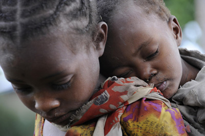 부게마을에서 한 소녀가 동생을 업고 식량배급을 기다리고 있다. 유엔은 가뭄
