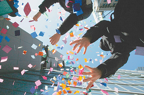29일 매년 미국 뉴욕 타임스스퀘어의 새해맞이 행사를 주관하는 비영리단체 회원들이 색종이가 잘 날리는지 예행련습을 해보고 있다. 새해로 바뀌는 31일 밤 12시에 시민들은 각자의 념원을 적은 종이 를 빌딩우에서 날릴 예정이다.