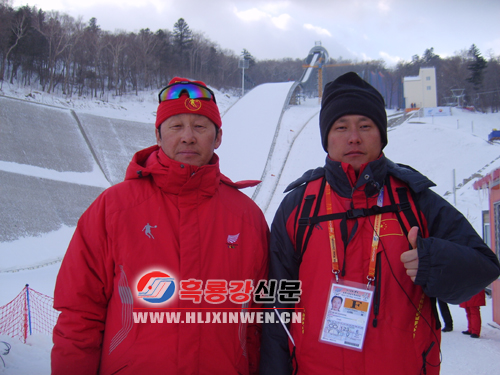 스키점프경기장에서 아버지를 모시고 포즈를 취한 박설봉감독(우) /본사기자 |