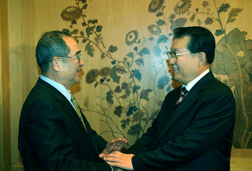 (흑룡강신문=하얼빈) = 리창춘 상무위원은 이수성 21세기 한중교류협회 고문, 한국 전 총리와 악수하고 있다.