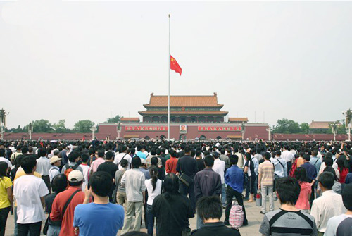 5월 19일 14시 28분 사람들이 북경 천안문광장에서 문천 대지진 조난자 동포를 묵념하고 있다. /신화사 |