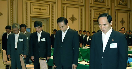 (흑룡강신문=하얼빈) 19일 오전 한국 청와대 영빈관에서 열린 제31회 국가과학기술위원회 회의에서 이명박 대통령과 참석자들이 故 김대중 전 대통령의 명복을 비는 묵념을 하고 있다.