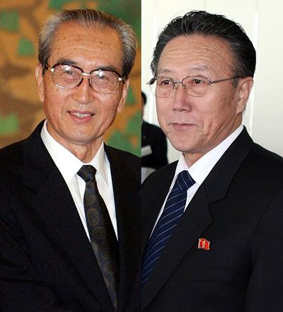 김기남(왼쪽) 노동당 비서와 김양건 통일전선부장(자료사진) |