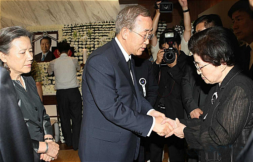 (흑룡강신문=하얼빈)김대중 전 대통령이 서거한 18일 서울 연세대 세브란스병원 장례식장에 마련된 김 전 대통령의 빈소를 찾은 반기문 UN사무총장 내외가 이희호 여사를 위로하고 있다. /연뉴