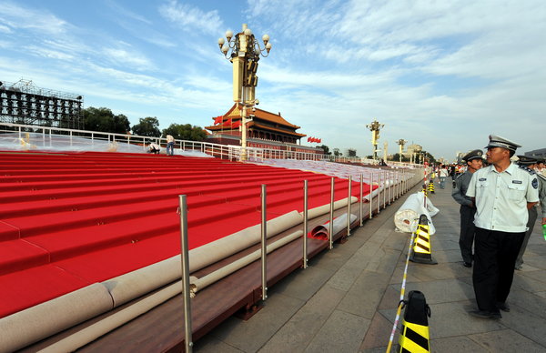 | 9월 15일 오후 노동자들이 톈안먼앞에서 임시 관람대에 붉은 주단을 깔고 있다. |