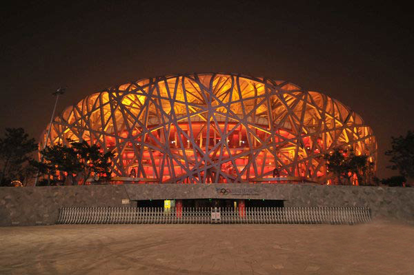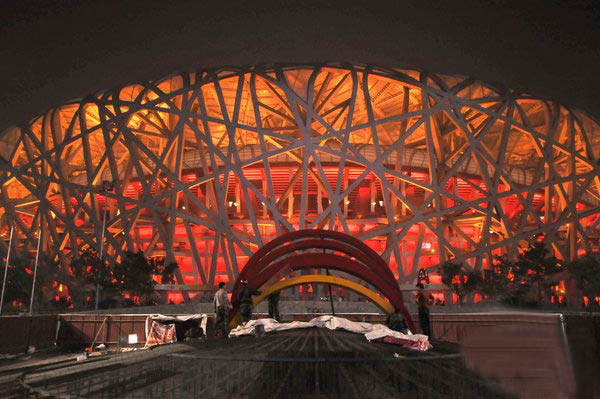 (흑룡강신문=하얼빈)9월 16일 저녁 촬영한 베이징올림픽중심구. 2009년 9월 16일 저녁 국경 60주년을 맞이하면서 베이징올림픽중심구에 밤도와 대형 화단을 세우고 있다.