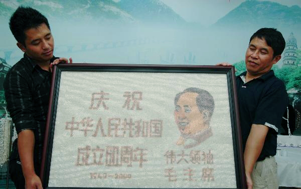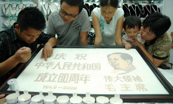 (흑룡강신문=하얼빈) 9월 27일 길이가 90센티미터, 너비가 60센티미터이며 3밀리미터 이하의 16만여개 진주로 만들어진 '위대한 영수 마오 주석'작품이 수저우 샹청구 워이탕진(苏州相城区渭塘镇)의 중국진주보석성에서 선보였다. 이는 지쇼우밍(计晓明)씨가 100날사이에 제작 완성, 신중국 창립 60주년을 축하하는 선물이었다.