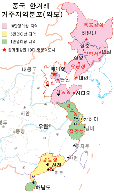 해당학자들의 통계수치에 따르면 현재 조선족인구는 195만여명으로 집계된다. 2005년 8월부터 10개월간 본사에서 추진한 '중국한겨레 사회어디까지 왔나?' 대형시리즈기획보도에 따르면 지난세기 90년대부터 오늘에 이르는 최근 10여년간 조선족들은 전통적인 거주지이던 동북3성과 내몽골 농촌지역에서 벗어나 점차 경제 발달지역인 연해도시로 확산되면서 북으로부터 남으로 동북3성 및 내몽골지역(약115만명), 북경, 천진을 중심으로 한 수도권지역(약 15만명), 청도, 위해, 연대를 아우르는 산동지역(약 16만명), 상해, 남경, 의오(义乌), 항주를 중심으로 한 화동지역(약 6만명), 심천, 광주를 중심으로 한 화남지역(약 4만명) 등 상대적인 5대 집거구를 형성하고있다. 한편 해외진출 조선족을 40여만명으로 추산하고 있는데 한국에만 38만명 된다.