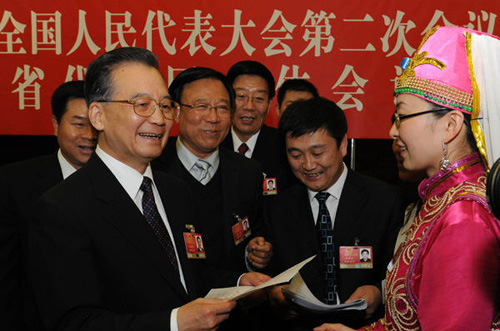 3월 6일 원자바오 중공중앙정치국 상무위원, 국무원 총리가 제11기 전국인민대표대회 2차회의 깐수대표단 심의에 참석하게 된다. 사진은 원 총리가 대표들의 의견을 청취했다.