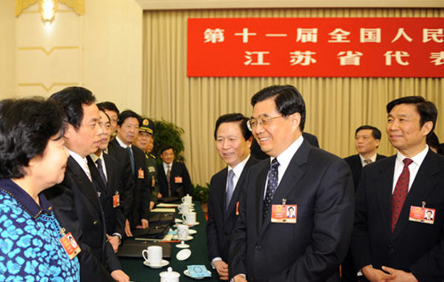 (흑룡강신문=하얼빈) 3월 5일 후진타오 중공중앙 총서기이자 국가주석이며 중앙군위 주석이 제11기 전국인민대표대회 2차회의 장수대표단 심의에 참석하게 된다. 후진타오 주석이 대표들과 친절하게 이야기를 나누고 있다.
