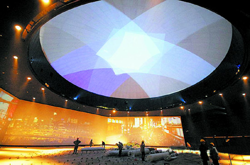 (흑룡강신문=하얼빈) 상해세계박람회 영구성 표지건물중 하나인 중국관 전시구역을 시험조절했다. 4월 20일 시운영을 하게 되는 이 건물에서 25일 시공일군들이 중국관 '동방의 발걸음'전시구역에서 다기능영화관을 정비하고있다.