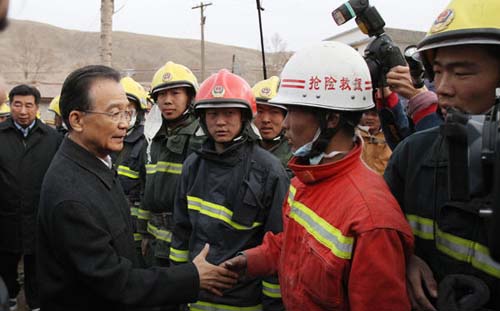 원자바오 총리가 구조대원들을 위문하고 있다. /신화사