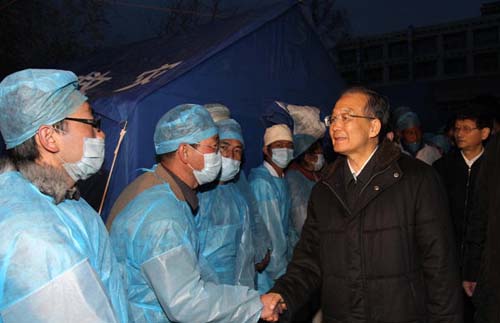 원자바오 총리가 의료인원들을 위문하고 있다. /신화사
