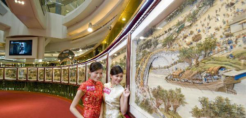 (흑룡강신문=하얼빈) 22일 홍콩의 한 상가에서 28폭의 종이조각 그림으로 만들어진 '청명상하도'를 선보였다. 이 '청명상하도'는 상하이엑스포 중국관에서 전시된다.