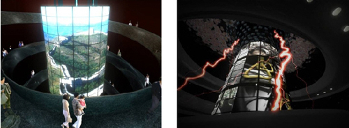 먼저 가장 눈에 들어오는 건 3층에서 2층으로 연결되는 슬로프 구간의 원통형 멀티미디어쇼<사진>.