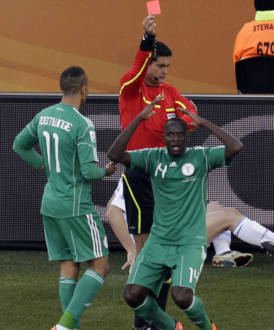 나이지리아의 사니 카이타는 사이드 라인에서 그리스 선수와 볼을 다투다가 순간적으로 발바닥으로 상대의 몸을 찍는 듯한 동작을 취했다. 주심은 망설임 없이 레드카드를 뽑았고 카이타는 머리를 감싸쥐고 퇴장했다.