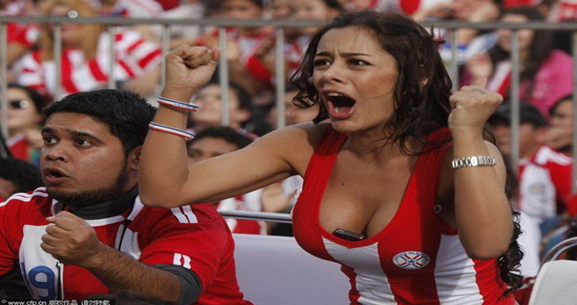 (흑룡강신문=하얼빈) = 파라과이와 이탈리아 첫 대결에서 현장 한 미모의 파라과이 축구팬이 카메라에 잡혔다. Larissa Riquelme라는 이름의 그녀는 파라과이 국내 저명한 모델로 월드컵아가씨 선발경기에 참가했다.