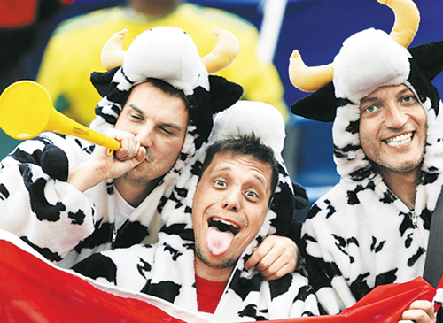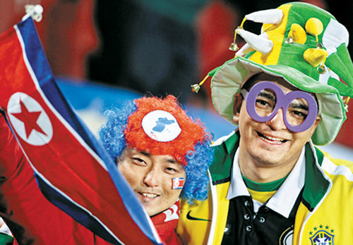 (흑룡강신문=하얼빈)남아프리카공화국의 월드컵 경기장에서 다양한 분장을 한 각국 응원단이 인종과 국적을 초월해 뜨거운 에너지를 발산하고 있다. 어깨동무를 한 조선과 브라질 응원단(좌), 젖소 분장을 한 스위스 응원단.