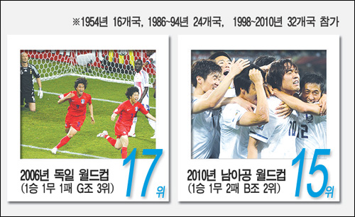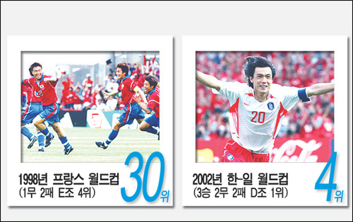 한국은 2002년 한-일월드컵에서 4강 신화를 이루며 탄력을 받고 20위권에서 벗어나기 시작했다. 2006년 독일 대회에선 1승1무1패(승점4)로조별리그서 아쉽게 탈락, 16강에 오르지 못한 국가 중에선 최고 성적인 17위를 마크했다. 이번 남아공 대회선 역대 두 번째 16강 진출(1승1무2패ㆍ승점4)로15위에 오르는 역사를 썼다. 하지만 16강 진출국 중 슬로바키아에 이어 최하위권에 머물렀다.