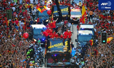 (흑룡강신문=하얼빈) 7월 12일(현지시간) 월드컵 우승을 차지한 스페인 선수단을 태운 차량이 수백만이 운집해 있는 마드리드 도로를 따라 카 퍼레이드를 하고 있다.