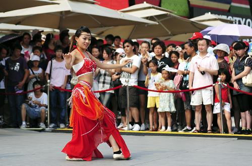 (흑룡강신문=하얼빈) 20일 상하이엑스포 C-10광장에서 관광객들이 춤을 감상하고 있다.