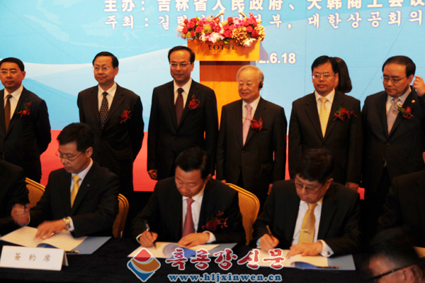길림성 손정재 당위서기, 진위근 부성장을 비롯한 고위간부와 기업계 인사들은 지난 18일 오전 서울 소공동 롯데호텔 크리스탈볼룸에서 열린 길림성인민정부와 대한상공회의소가 공동 주최한 ‘한국 서울-중국 길림 경제무역교류회’에서 48개 중한 협력 프로젝트 집중 조인식을 가졌다.