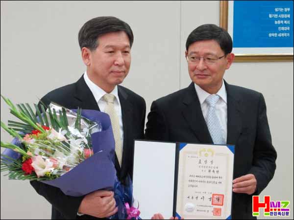 대통령상을 받고 있는 전 심양한국인회 권유현회장과 심양총영사관 조백상 총영사 |