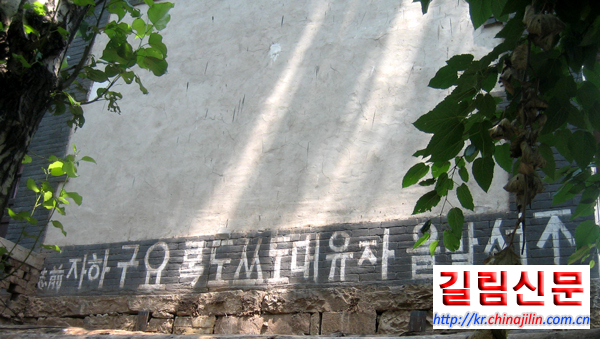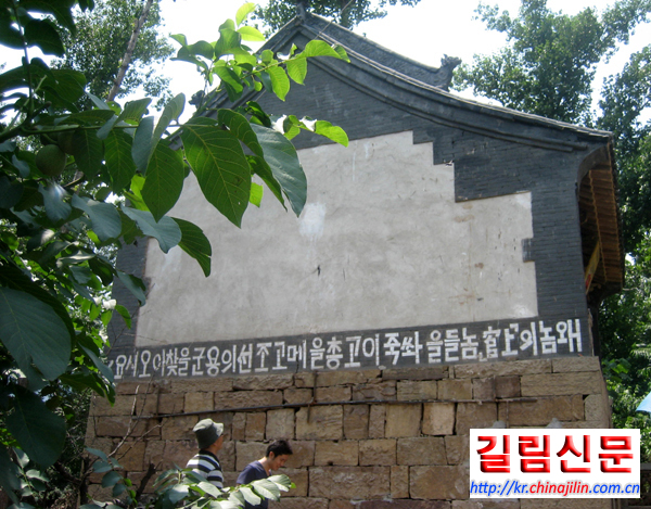 성문동쪽에 씌여진 선전구호, 70년동안 촌민들에 의해 보존되여있다.