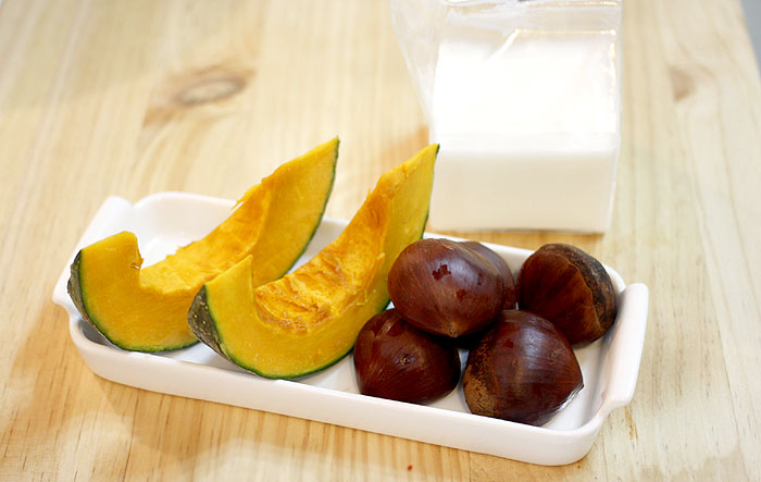 재료: 단호박 , 밤, 우유 단호박은 속을 파내고, 밤은 껍질을 벗겨 찝니다