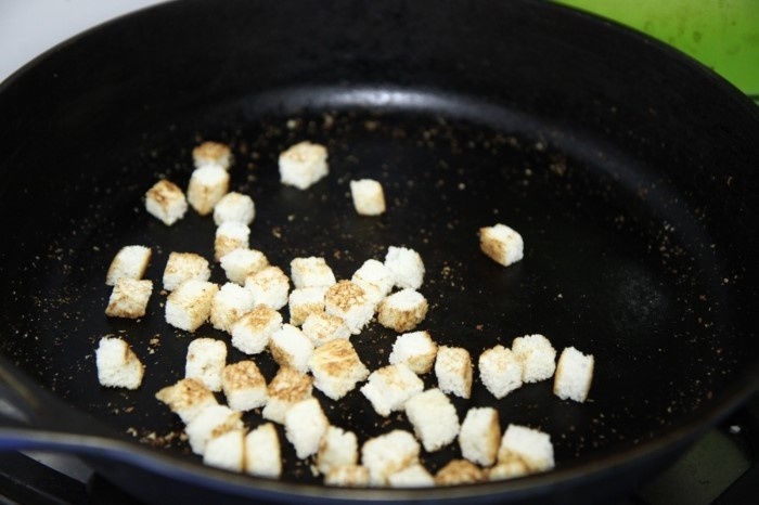 식빵은 사방 0.8cm로 자른 후 기름을 두르지 않은 팬에