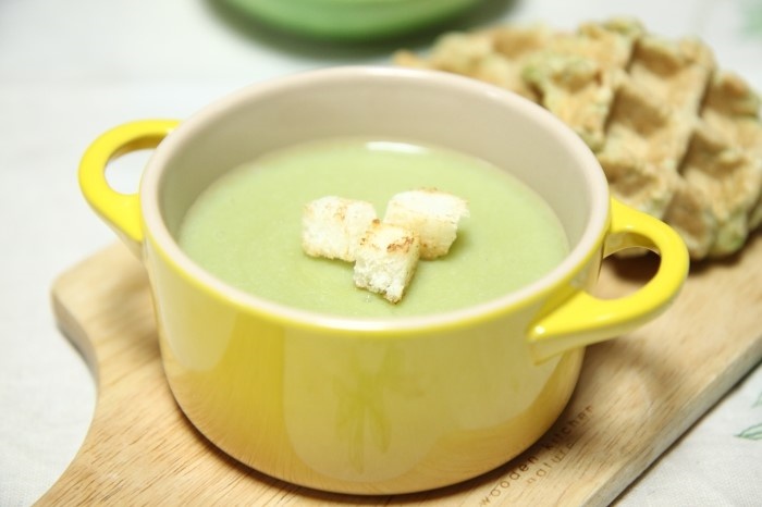 완성된 그린피스스프에 크루통을 살짝 올려주면 완성!