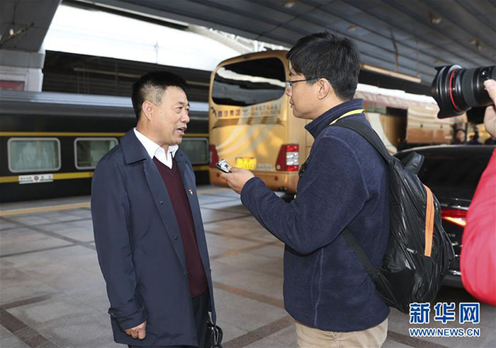 (흑룡강신문=하얼빈)10월 16일, 19차 당대회에 참석하는 헤이룽장성 대표들이 베이징에 도착했다. 사진은 리펑위(李凤玉) 대표(왼쪽)가 기자의 인터뷰를 받고 있는 모습./신화넷