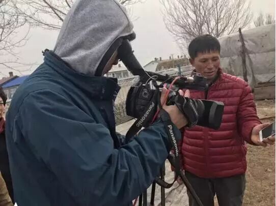 천옥금 리사장이 가동식에서 할빈시TV 기자의 인터뷰를 받고있는 장면