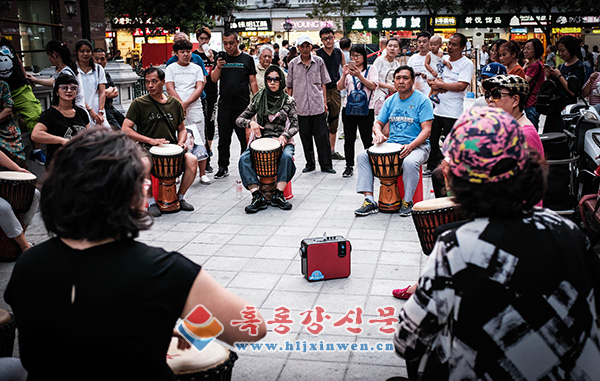 음악동호인들이 하얼빈 중앙대가에서 이색적인 연주를 선보이고 있다./ 주성일 기자