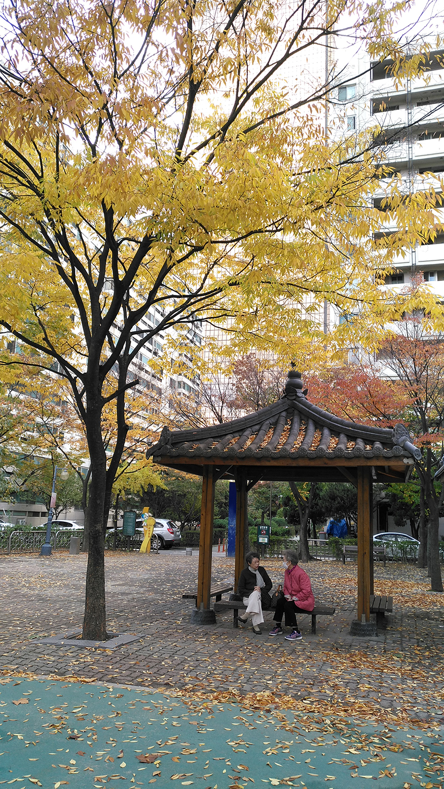 (흑룡강신문=하얼빈)지난 10월 말의 어느날, 한국 영등포구 여의도의 한 아파트단지의 정자아래서 두 로인이 옛 이야기를 나누고 있다. /문경택 (화위 P10)