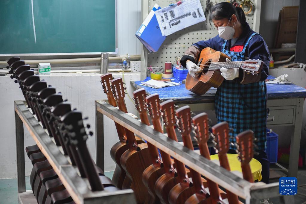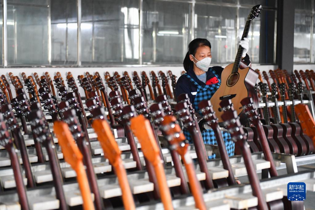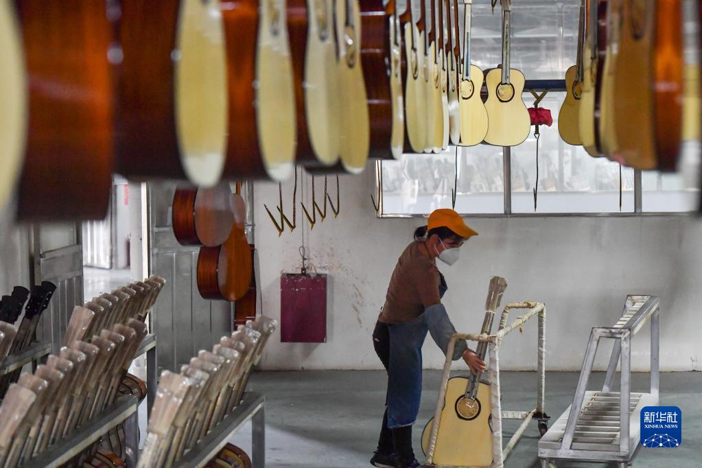 11월 3일, 동안경제개발구의 한 기타생산기업에서 로동자들이 도색이 끝난 기타를 정리하고있다.